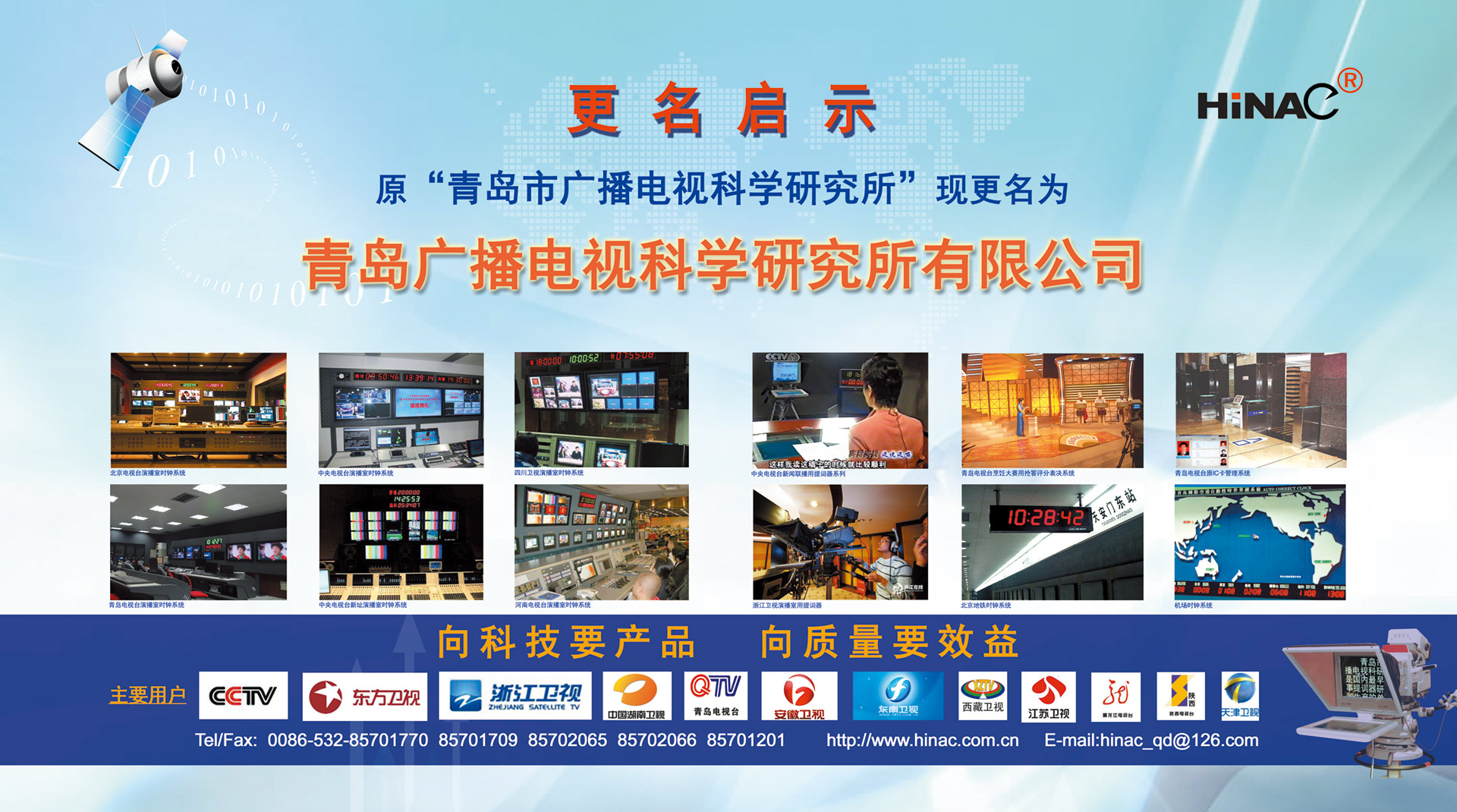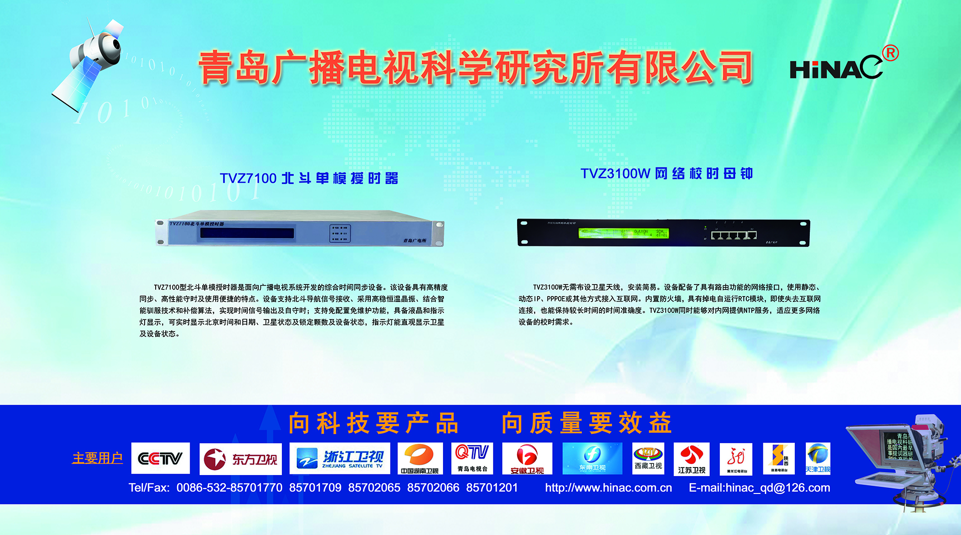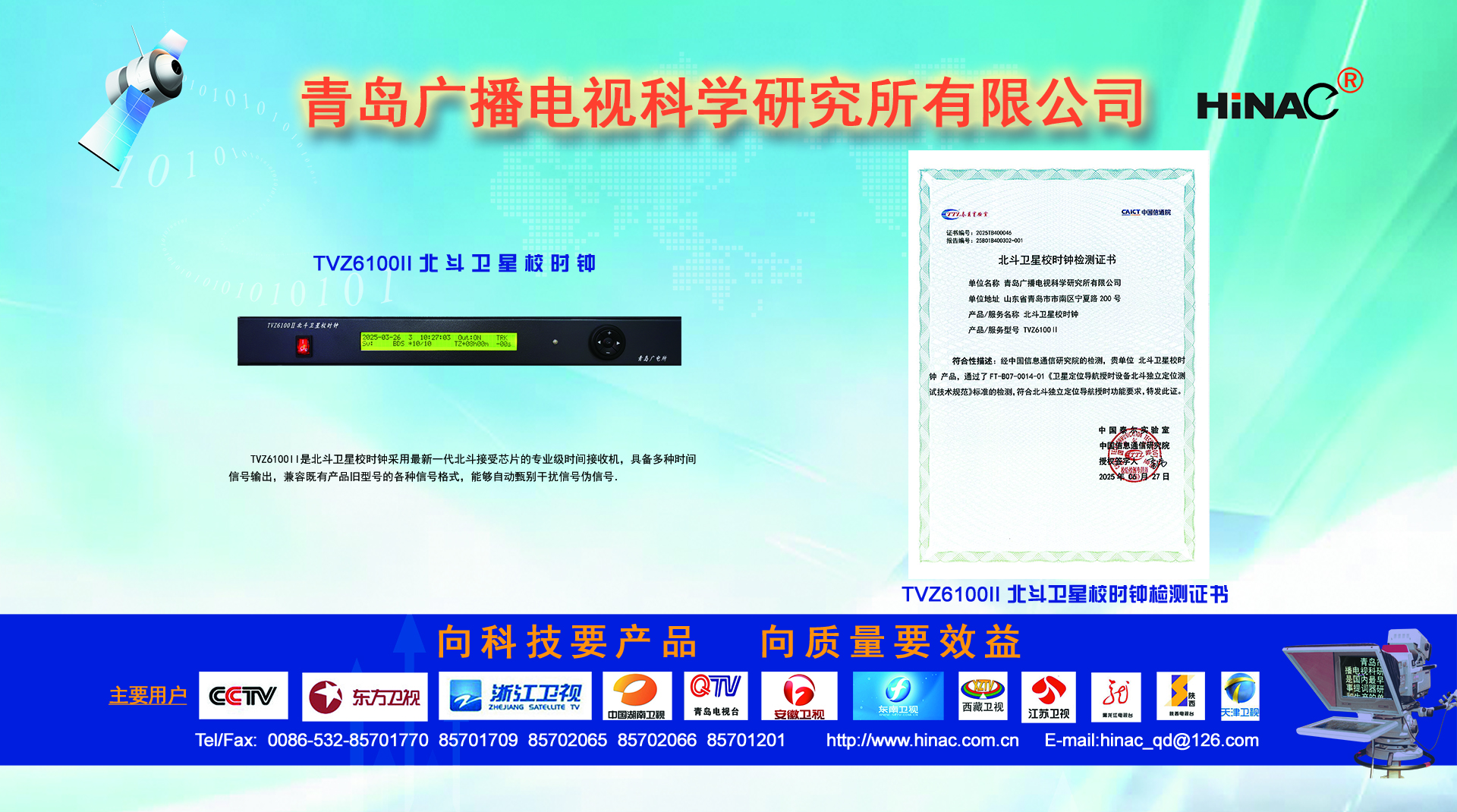 25年不悔的執(zhí)著追求! 25年不懈的專業(yè)堅持! 青島廣播電視科學研究所有限公司(簡稱青島廣電所)以其對廣電科技事業(yè)無限的熱愛,以及為爭做中國最優(yōu)秀廣電產品供應商的美好理想,25年如一日,深耕廣電設備這塊沃土,已經形成且被市場高度認可的成果有: TVZ系列GPS/北斗自動校時鐘系統(tǒng) TC系列電視播音提詞器及電視直播系統(tǒng)整體解決方案 TL系列泰麗訊源指示系統(tǒng) QD系列搶答表決評分系統(tǒng) IC系列廣電一卡通管理系統(tǒng) 同時向:廣電設備集成商、地鐵輕軌信號系統(tǒng)設備供應商及其它業(yè)務方向創(chuàng)新、拓展、前行! 青島廣電所在國家廣電傳媒事業(yè)不斷發(fā)展的今天,愿意和您攜手并進,為我們共同的事業(yè)發(fā)展添磚加瓦開拓創(chuàng)新。愿意和您一道,把工作中的一個奇思妙想轉變?yōu)橐豁梻?..